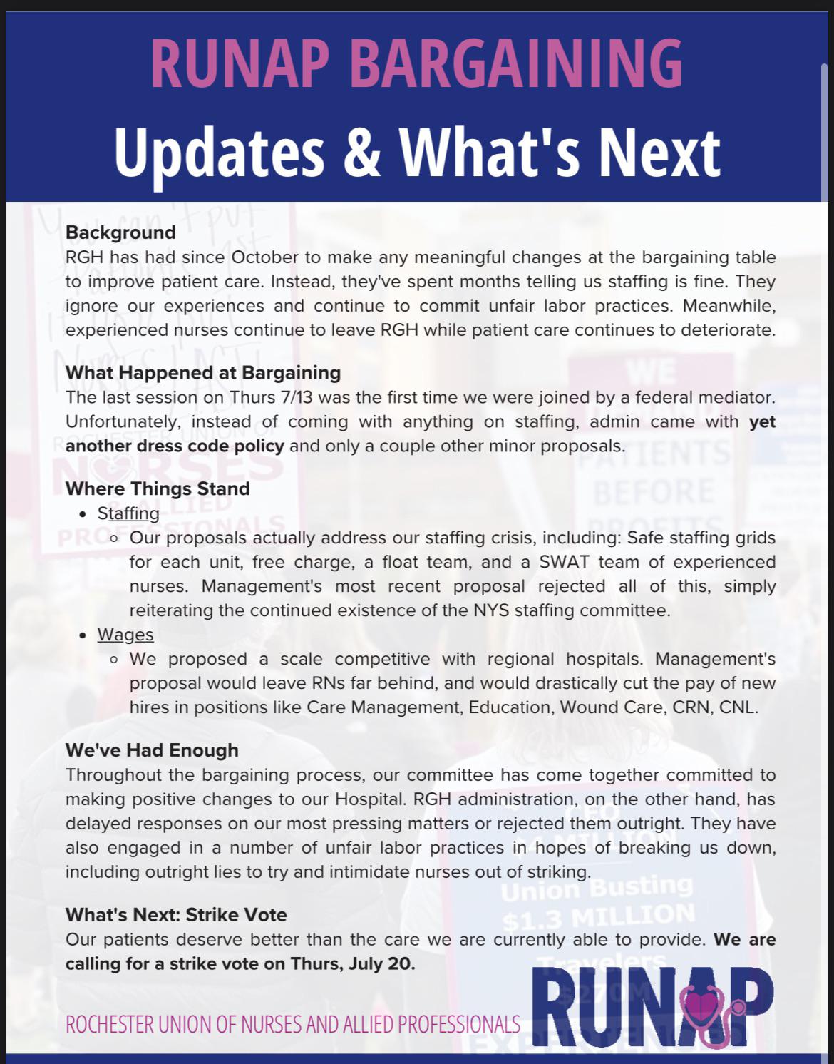 Nurses in Rochester, NY have no choice. Profit minded health systems have, for years, made decision after decision that worsens patient outcomes, and slides the responsibility for lapses of care onto the providers. Running ratios of patients to nurses sometimes double the recommended standard, the Rochester Union of Nurses and Allied Professionals (RUNAP) report that within their system hospital-acquired infection rates are sometimes close to 90% higher than average. The union further states that as patient-nurse ratios increase, mortality and re-admission rates also significantly increase.